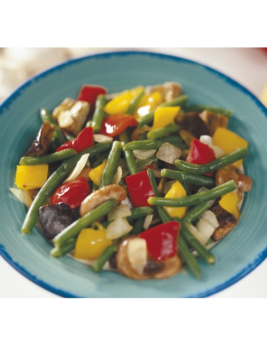 Judía verde redonda, berenjena troceada, cebolla, champiñón, pimiento rojo y pimiento amarillo ideal como acmpañamiento o primer plato