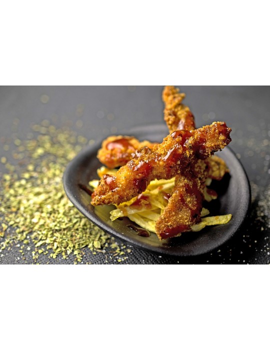 Pechuga de pollo cortada en tiras y marinada recubierta de un crujiente rebozado cajun.